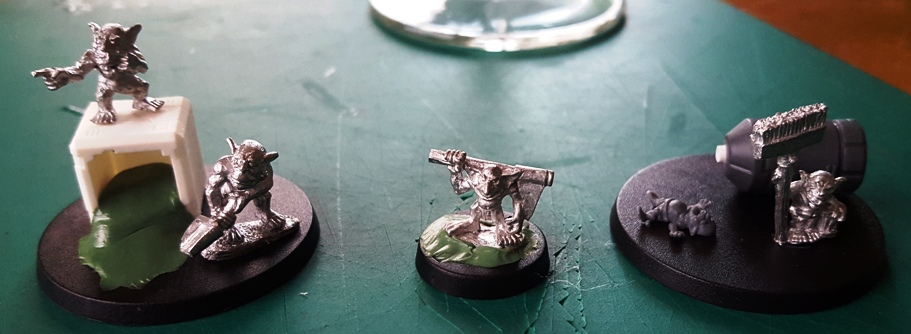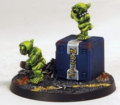 The little green guys are both Foundry Snorklings (actually Im not 100% certain about the guy with the shovel, but I am pretty sure). The crate is from Antenocitis workshop. The “tackz” are made from a load of cocktail stick points glued to a slope of green stuff (as visible in the WIP shot).