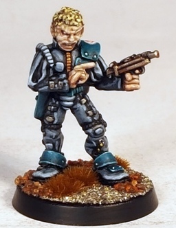 The turquoise-blue was a deliberate attempt to brighten the figures up a little, to visually bridge the gap between the more Mega City One type civilians and the 40k ones. I try to keep my miniatures bright, even if they should technically be drab or dark. Even a dull or dingy miniature character should have visual “pop” I think.