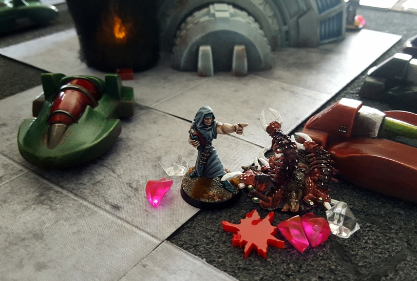 The Kabereoi Castellan robot immediately engages its auto-targeting systems on the learned chitinous gent as it closes on the Captain, the battle is now officially an interstellar four-way.