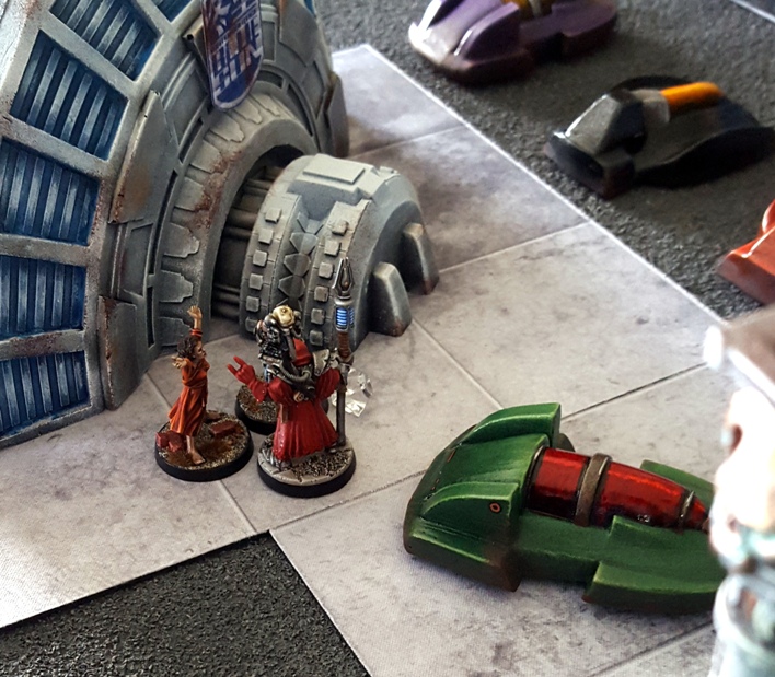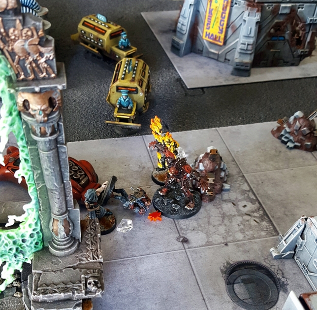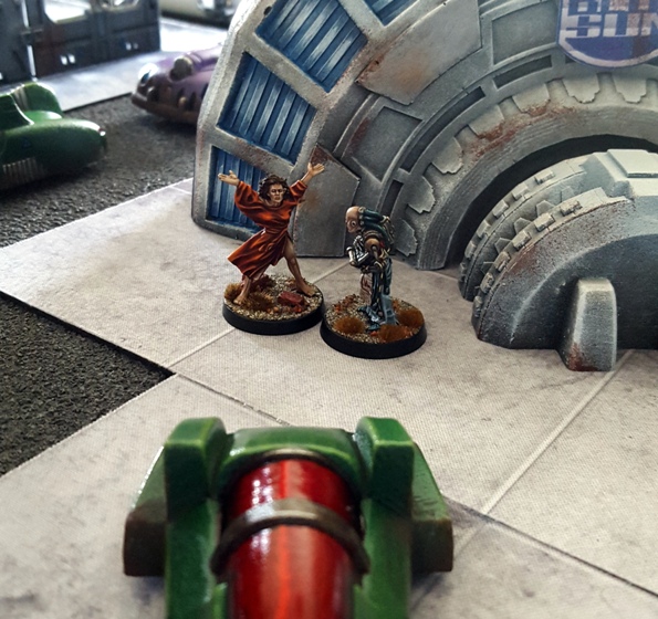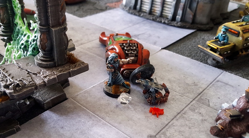 Taking advantage of the robots covering fire, Magos Kurgan uses his hypnotic gaze to show Clerk Beancounter how to get on a womans good side, the genestealer way.