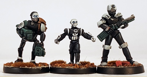 The plan for the butler came first and spun into a general monochrome scheme for the service industry ‘bots. I batch painted the three up to a point and then finished them off individually.