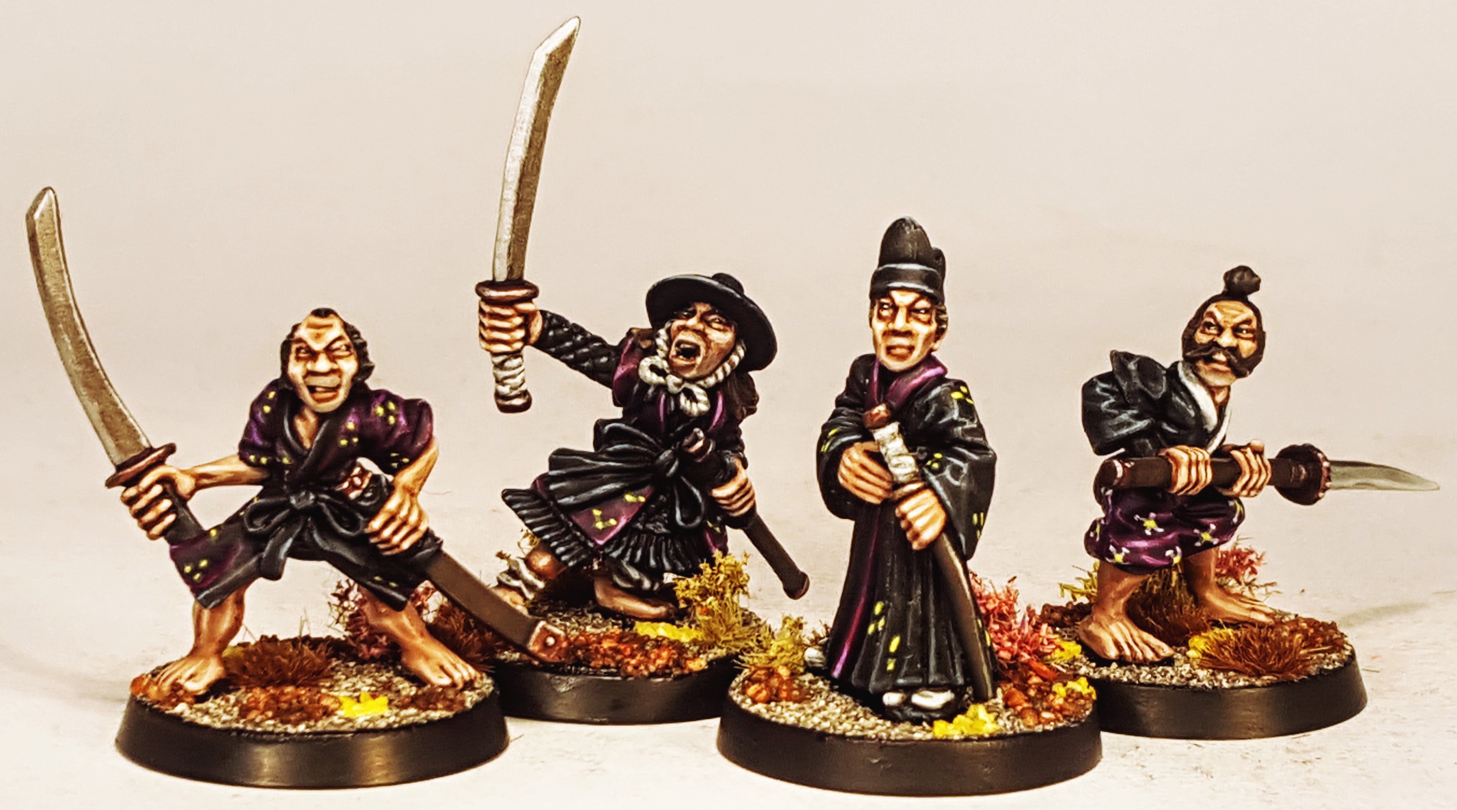 These three figures are from the old Aly Morrison sculpted GW “Oriental Heroes” range. The proportions and style have a certain flavour of caricature going on that makes them very appealing and pleasant to paint. They are almost like Asterix characters.
