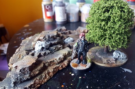 The process was straightforward. Hot glue bits of cork tile of descending size on each other. Roughly apply patterns of colours that suit your tabletop to the bases, almost like a camouflage pattern. Use drybrushing and inks to bring them together a bit.