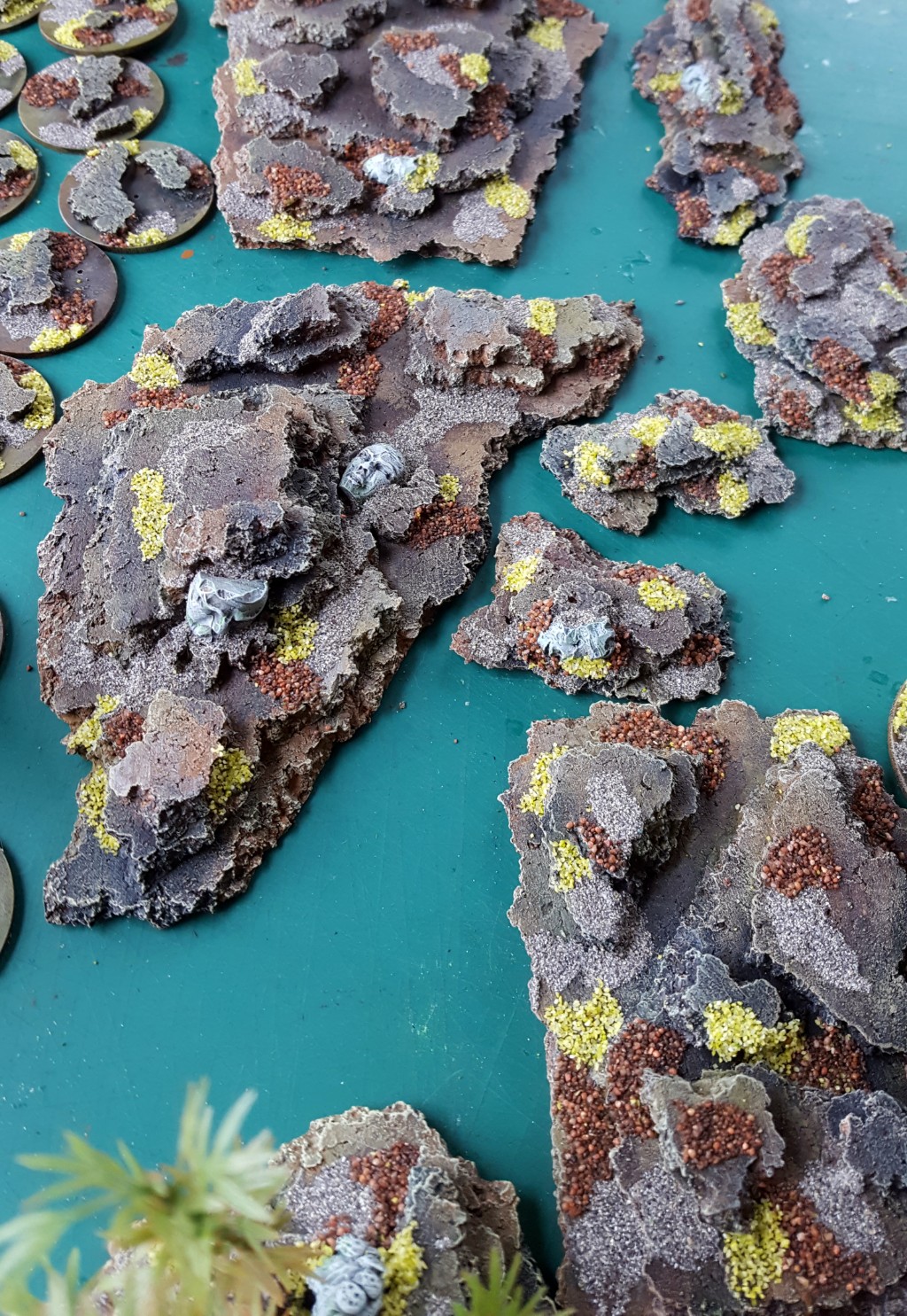 The process was straightforward. Hot glue bits of cork tile of descending size on each other. Roughly apply patterns of colours that suit your tabletop to the bases, almost like a camouflage pattern. Use drybrushing and inks to bring them together a bit.