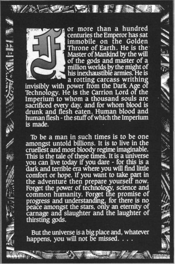 One of the things that I liked about Warhammer 40,000 when I first read Rogue Trader was its vast sandbox element. The various Imperial institutions, alien empires, exotic wildlife and environments in an incomprehensibly large galaxy were presented as a springboard to launch your own stories via.