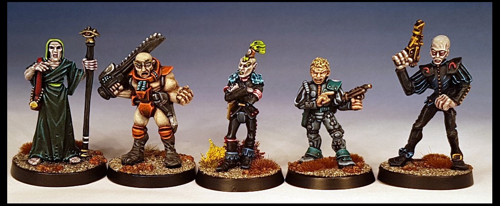 My painted RT Adventurers to date. L to R: Astropath Yerl, Scum/Space Eunuch, Eldar Trader, Official, Navigator.