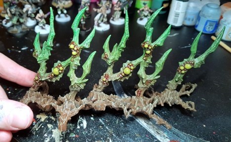 A few washes of Army Painter Green were added towards the top of the spines.  GW Niblet Green was drybrushed here and there, focusing on the vaguely shell like shapes that appear on the sides of most of the spines.  A little bit of an acid yellow colour with a bit of green in it was drybrushed on to those areas too.
