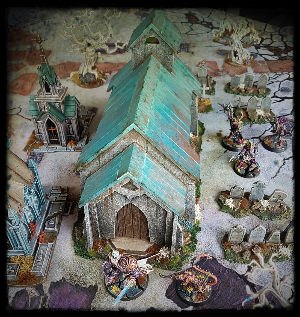 It has been a few years since I put together my St. Cranium’s graveyard terrain set. Last year I decided to expand it out to cover a 6×4′ table, starting with a lot more gravestones. This church was the next step.