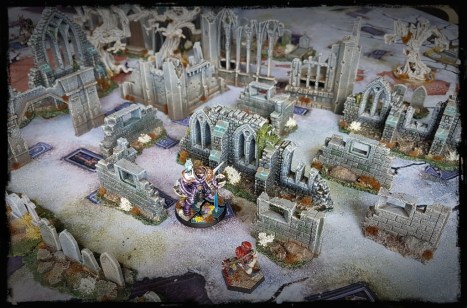 Paulo Ringseeker – Knight Questor of the Justified Ancients – is the target of an assassination attempt at camp. The pesky Nighthaunt forces of Lord Helior the Buoyant fear to not-tread in the ruined church (bottom left).