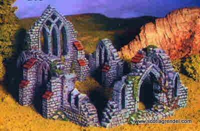 I picked this ruined “cathedral” and some other resin walls up from Scotia Grendel at some point over the last few years. The church is quite an old model design: I’m pretty sure that I remember seeing it in the Virgin Megastore on Oxford Street, London in around 1991.