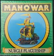 While imagining what huge, fat, rotting, magical pirates might look like while swinging from a flying ship, feet first into cranky treepeople, I remembered that the 1993 Games Workshop game “Man O’ War” featured Nurgle ships.