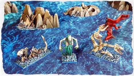 L to R: Leech Wyrm, Sea Giant, Bone Hydra. I added bases to these because they kept falling over. The putty work on the “waves” is very crude, but I think that I know how to make it a bit better next time. Take note Michael Bay, I’m learning not to endlessly repeat the same creative mistakes.