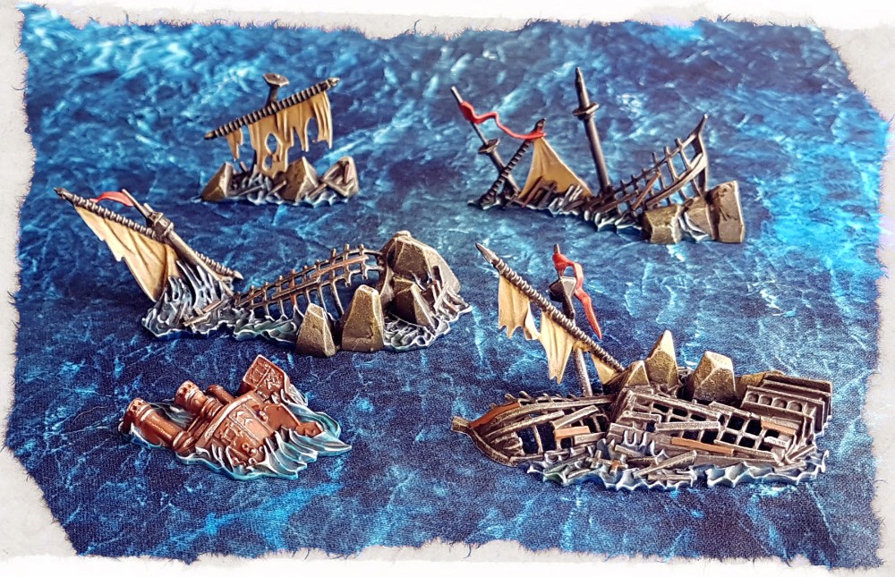 I painted the shipwrecks to look a bit like corporeal shipwrecks, rather than the g-g-g-ghostly shipwreck motif in the studio colour scheme.