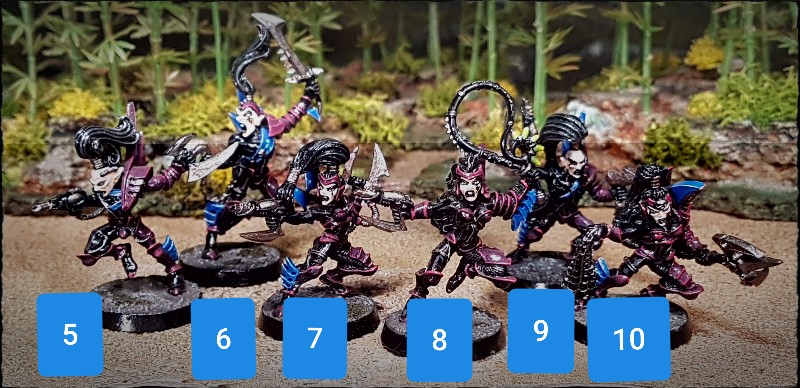 6: Peithia Ehlynna, Darkly Flamboyant, Combat Specialist Wych warrior armed with razorflails and plasma grenades.