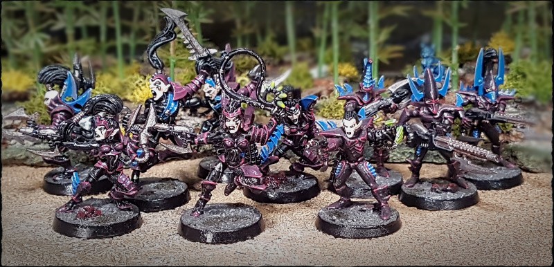 These look good…but I may be one of the few people who liked these wonky old Dark Eldar (though the plastic warriors were never that great…. the metals were mostly pretty cool and still stand up ok today, IMO). Love your paintjobs anyway and the background is amusing.