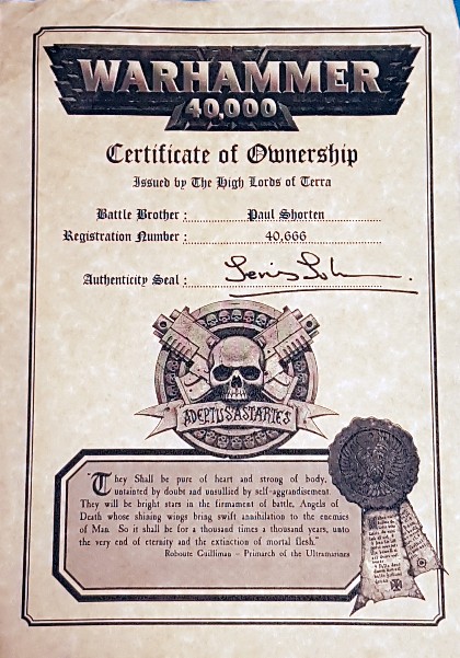 I got this cert when I pre-ordered 40k 3rd ed in 1998. I was particularly pleased to get the 666th of the 1000 numbered copies, although if they all had that printed on them, then please don’t ruin it for me.