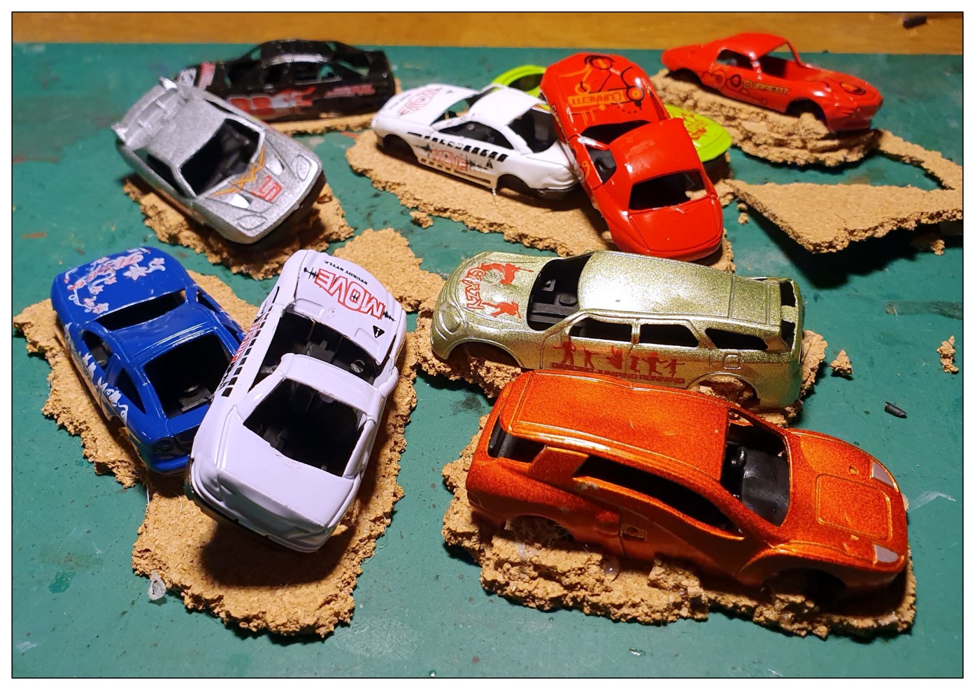 Next I hot glued the cars to pieces of torn up cork tile, building up the base in some of the wheel wells etc, both for added base rigidity and also to add a little visual weight to the wrecks.