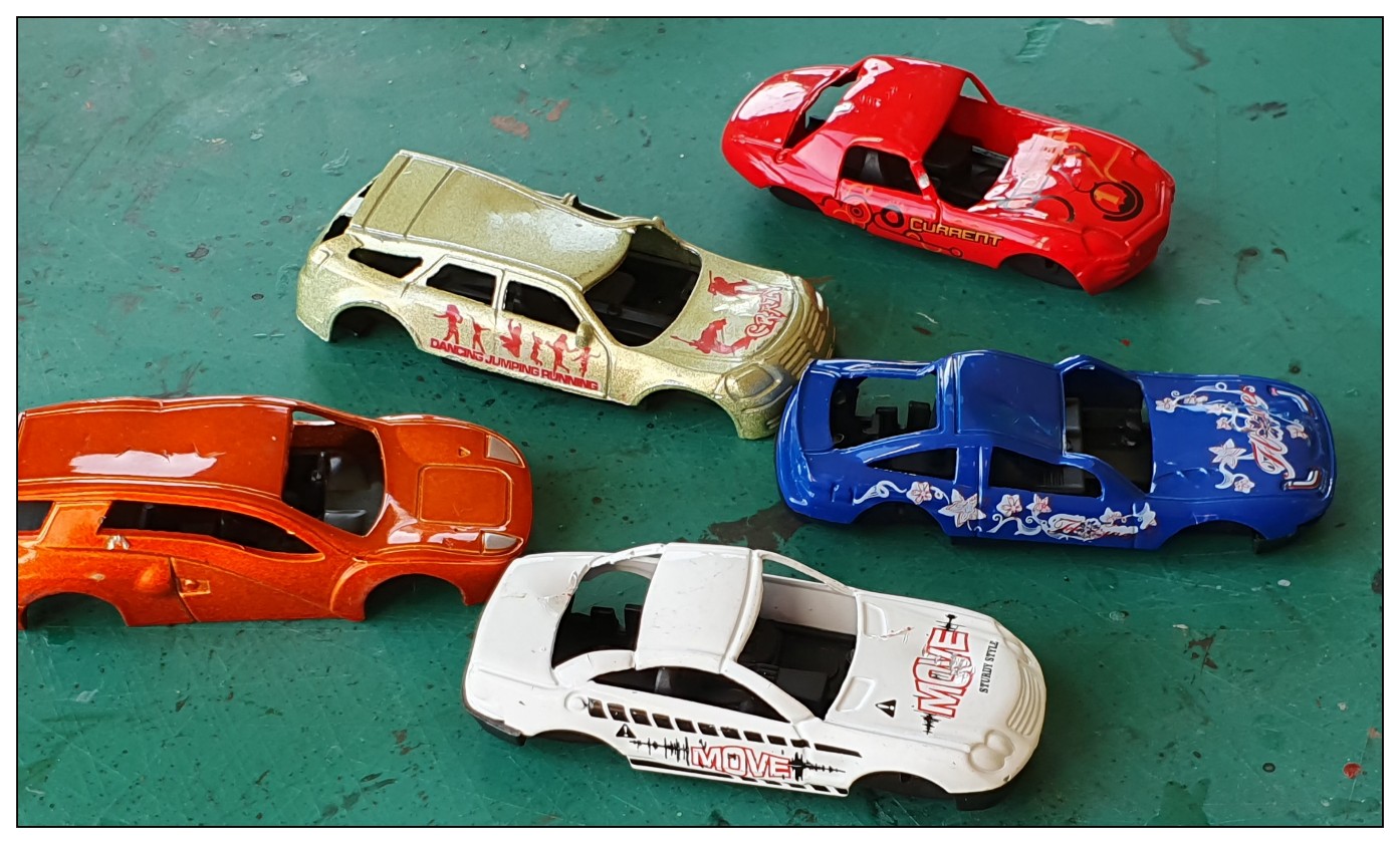 I bought ten of the cheapest toy cars that I could find, took them apart, removed the wheels and windows and re-attached the chassis.