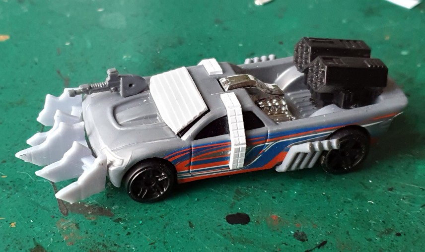 My buddy Aiteal had supplied me with a number of 3D printed elements ready to turn my toy cars into instruments of destruction, but to date I had not managed to include any rocket launchers. The flatbed rear of the Katy proved perfect to mount the launcher (and also the inspiration for the name) and while that weapon is more high tech than the various machine guns etc already mounted on some of my toy cars, it wasnt’ quite the bleeding edge sci-fi high tech that I was after.