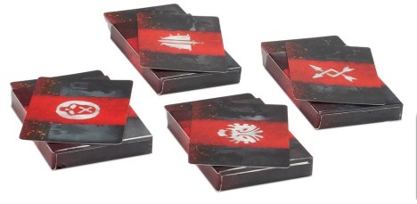 Clockwise from top centre: Victory, Twist, Terrain and Deployment decks.