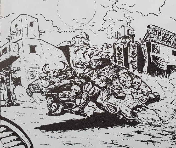 Pages 224 to 228 of the Rogue Trader rulebook contained a mind expanding case study of the town of “Helsreach”, a frontier town located on the “Logan’s World”, a planet on the edge of the “Eye of Terror” that can only be accessed intermittently, due to warp storms. The Carl Critchlow illustrations are just perfect I reckon, even 34 years later.