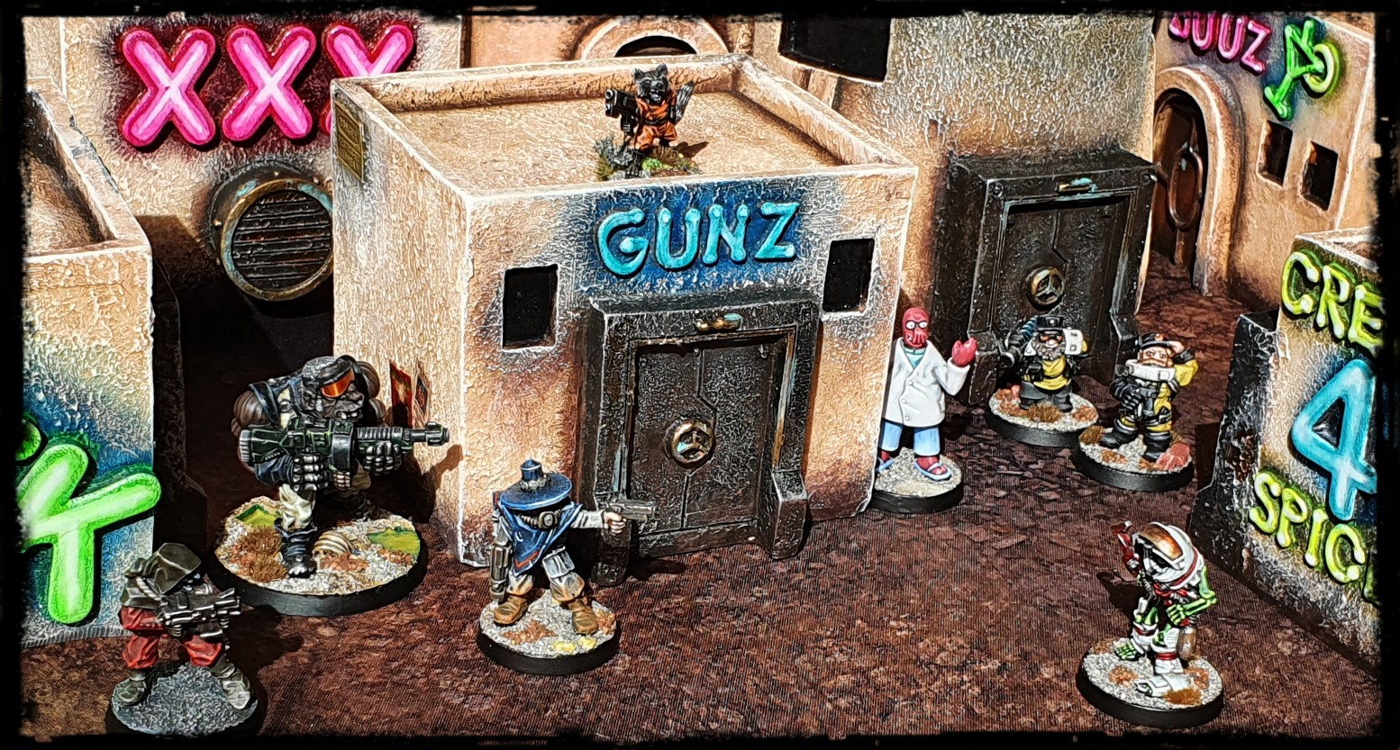 My post-apocalyptic town – Standard Falls – would technically have covered all of the gaming requirements that Stargrave would throw up, but I just wanted a certain sort of classic sci-fi town aesthetic for playing this game in particular. Mos Xcellent is now open for business.