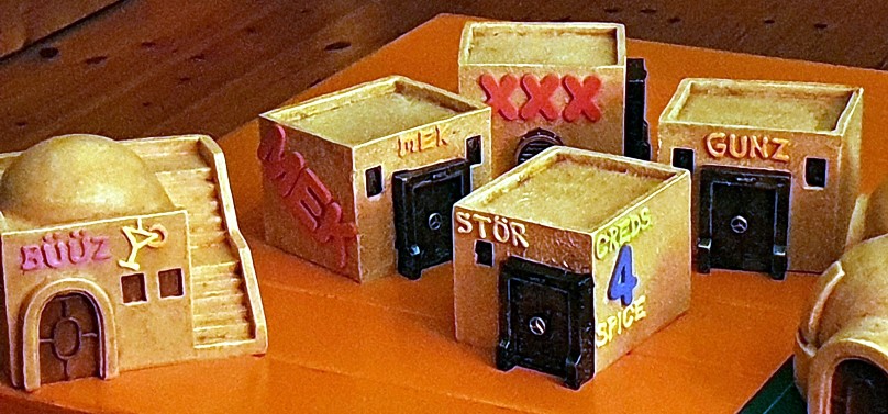 I left most of the domed buildings without posters and signs, so that they can represent remote homesteads and farms etc while also bulking out the terrain when it represents Mos Xcellent town centre.
