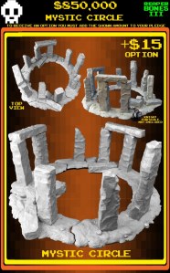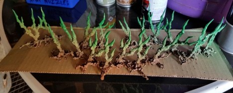 Five Citadel “Shardwrack Spines” painted to look a little like space cacti. I like the visual that these have, it’s nice for photo backdrops in addition to game terrain. The paintjob was super rapid: spray cans, drybrushing and washes, with a little bit of blobbing on “Nurgles Rot” onto the bulbous areas.