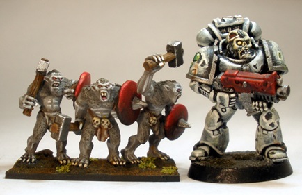 Painting was straightforward. I considered painting them a shade of green but the scaly shoulders, knees and arse were obviously designed under influence from the troll design in the Lord of the Rings movies, so I went with an approximation of that. I enjoy painting pale flesh tones anyway.